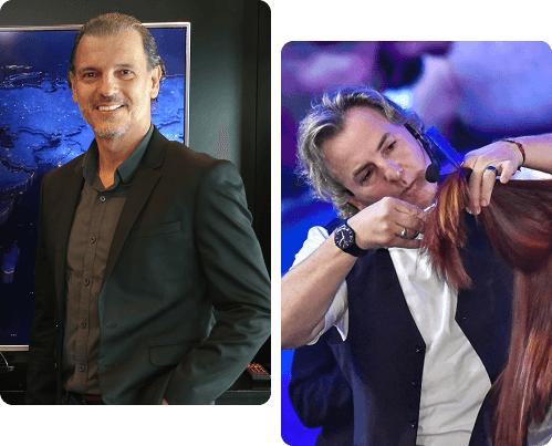 A su lado, Roberto, estilista internacional y referente en formación, combina experiencia, creatividad y compromiso con el desarrollo profesional de toda América.